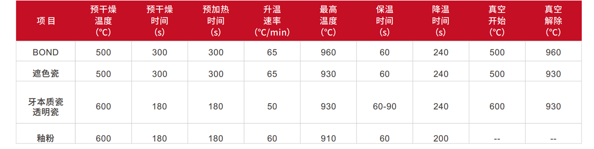 以上操作參數對使用者只是參考,如果燒結后的修復體表面特征,透性及光亮程度與理想狀態(tài)不一致,必須調整相應的燒結程序。燒結程序的決定因素不是烤瓷爐的顯示溫度,而是燒結對象燒結后的外觀(guān)及表面特性。